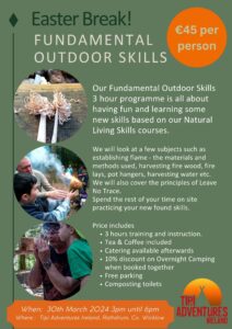 When: 30th March 2024 3pm until 6pm.  Our Fundamental Outdoor Skills 3 hour programme is all about having fun and learning some new skills based on our Natural Living Skills courses.