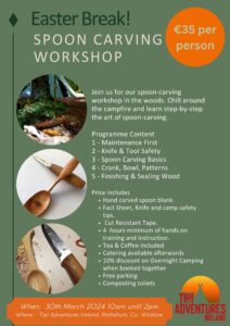 When: 30th March 2024 10am until 2pm. Join us for our spoon-carving workshop in the woods. Chill around the campfire and learn step-by-step the art of spoon-carving.
